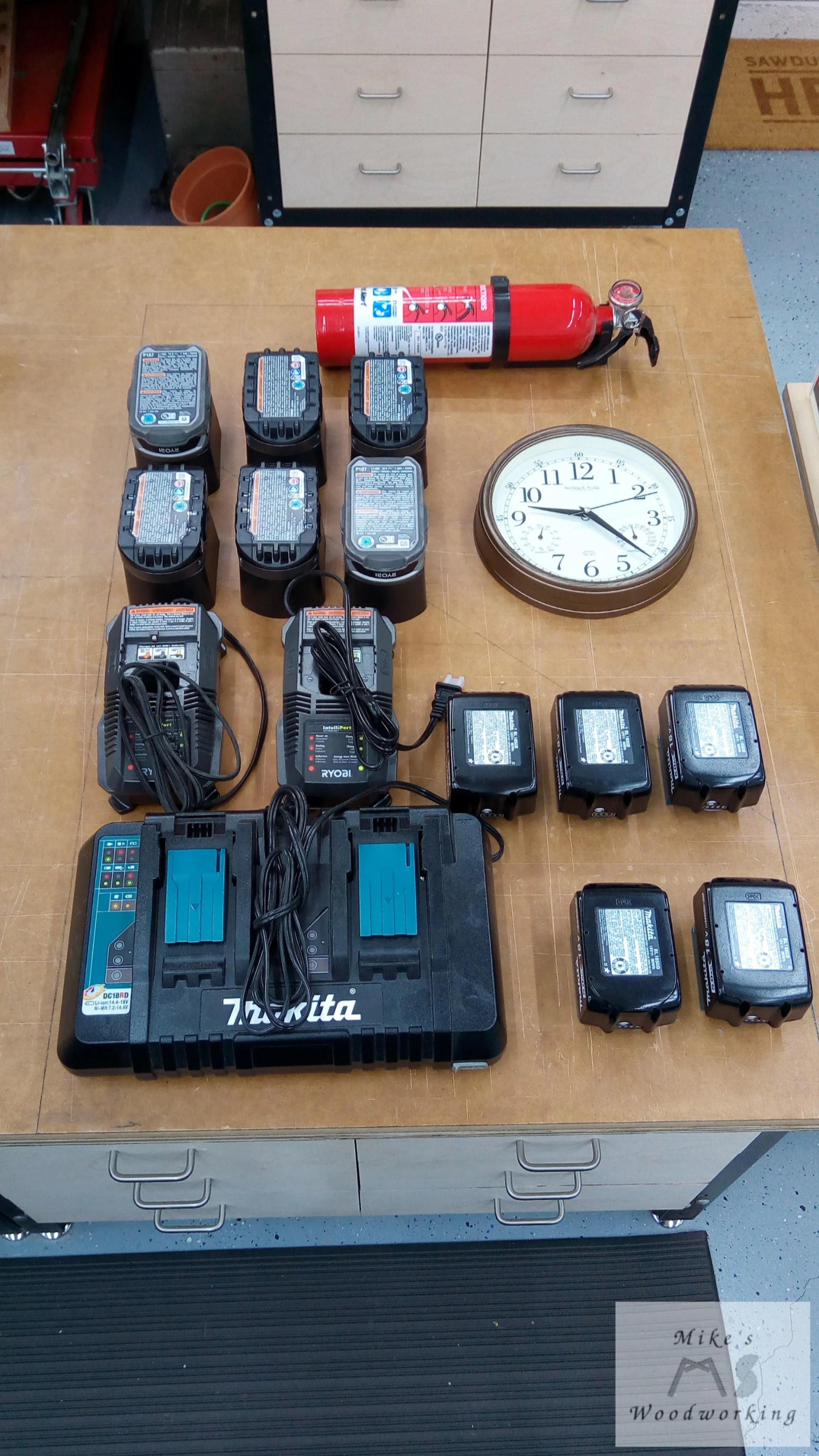 One thing I AM content with is the fact that I have all of my Ryobi and Makita batteries and chargers, along with my clock and fire extinguisher, hanging on the side of the scrapwood cabinet. This is an ideal location for all of these, not to mention the only convenient place available for all of these items in the shop.